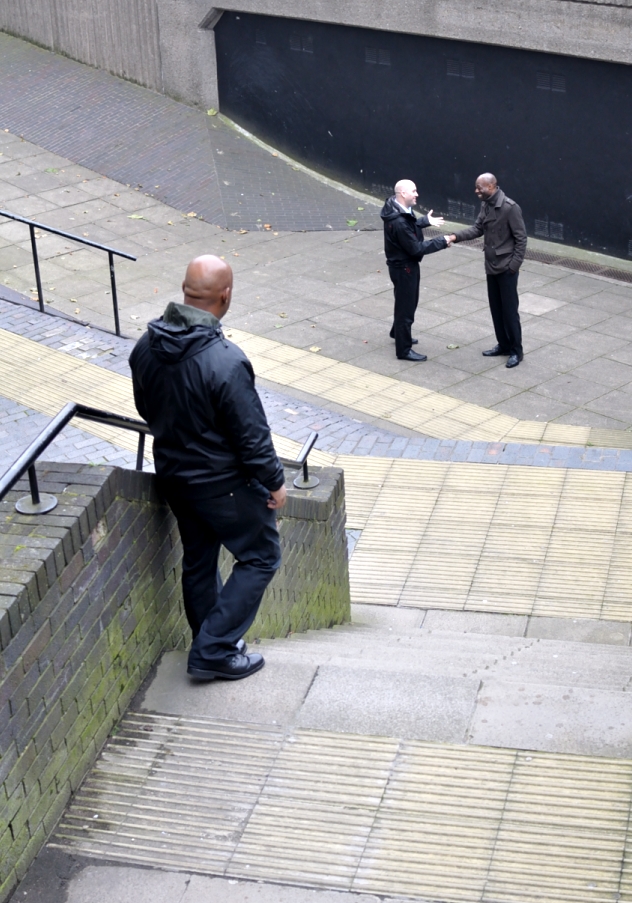 I decided to stage the first shot with the help of a few friends from work. I think they were a bit nervous about being directed by me and I was a bit nervous about directing them. This is shot in a courtyard by the Merrion Centre in Leeds. (I’ll have a couple more shots from here later in the week.) I like it, but it could have been better. In fact it was suggested a landscape version of this might have been better. I think that is probably right.